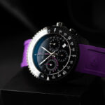 Der Meridian „Purple Stealth“ Chrono ist eine, wie der Name schon sagt, Stealth-Uhr und somit komplett in Schwarz gehalten… naja, bis auf die Lila-Akzente.